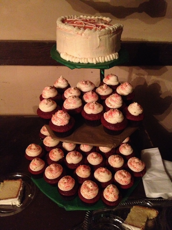 In my discussions with the bride and groom, I was told that instead of a traditional tiered wedding cake, they wanted a tree of red velvet cupcakes and a small 6 inch cake on top for them to cut. Later on, the bride informed me that the groom’s mother had insisted on making a cake for the wedding as well, and that it would be a “groom’s cake.” Traditionally, groom’s cakes are not as large as the wedding cake, are gifts from the bride to her groom, and usually are made to represent the grooms personality and interests. I had no problem with this, seeing it as insurance that there would be plenty of food for all.