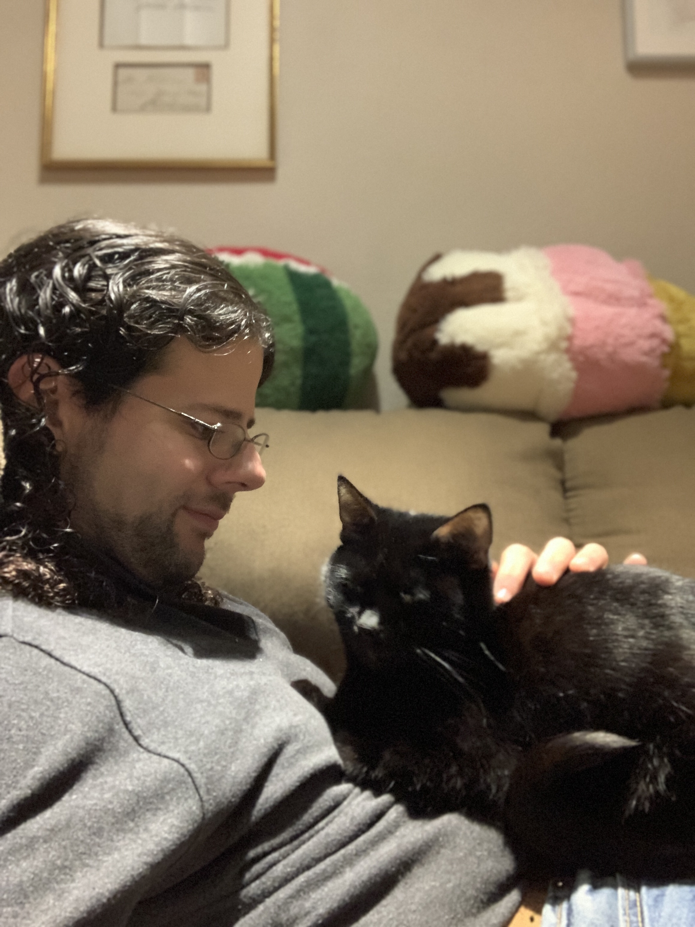 Writing on the couch is usually a tricky business. Sometimes Cleo just sits on my legs (behind where I usually have my typing machine set up) and crashes out, but recently I’ve learned that for cats, mirroring behavior communicates inclusion in the group/family. Hence, whatever I’m doing, Cleo must immediately involve herself in (usually by sitting directly on my lap or keyboard.)