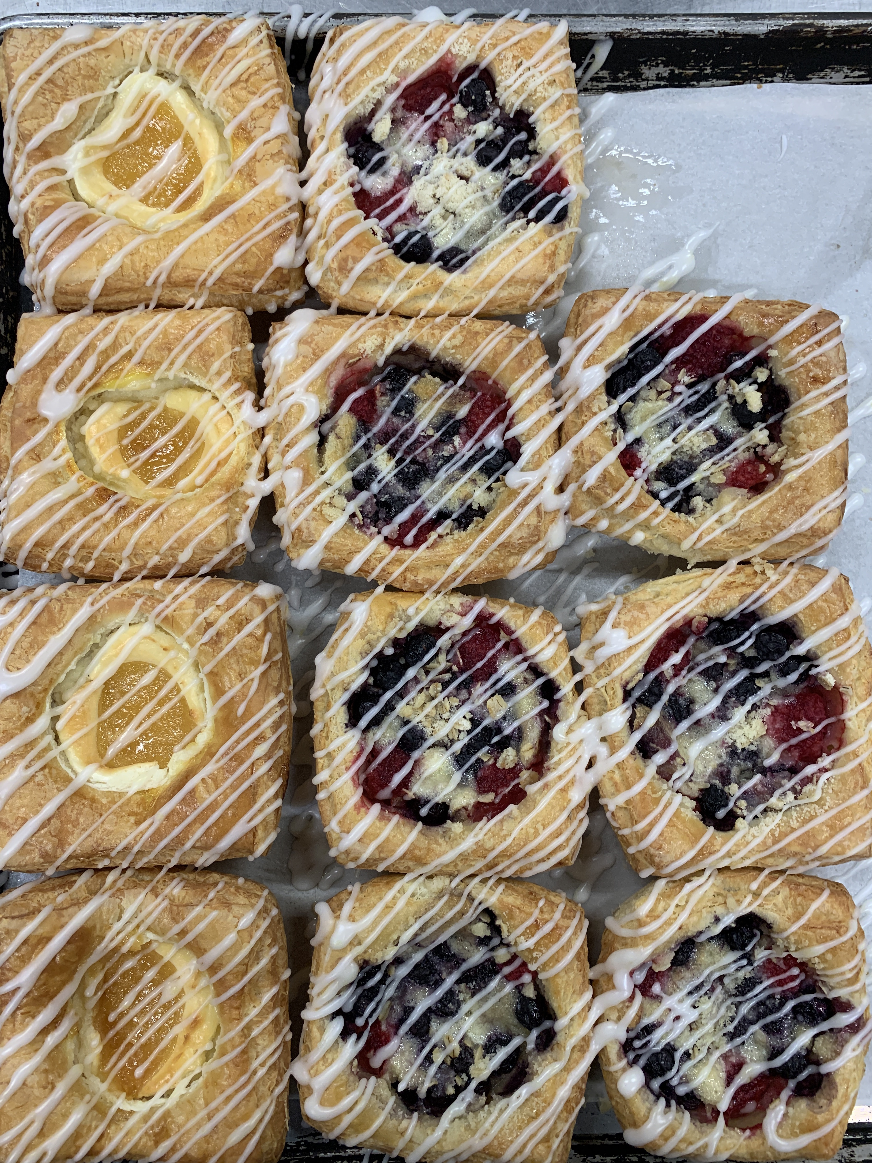 My job is to do the prep for cold pastry, make sure morning bake has all the sauces and batters they need, and bake off pastries that are too complex to work into the morning- danishes, scones, muffins, and monkey bread. The pastries themselves AREN’T complex, but the steps to making them are a big too much for an already-rushed overlord to manage well.