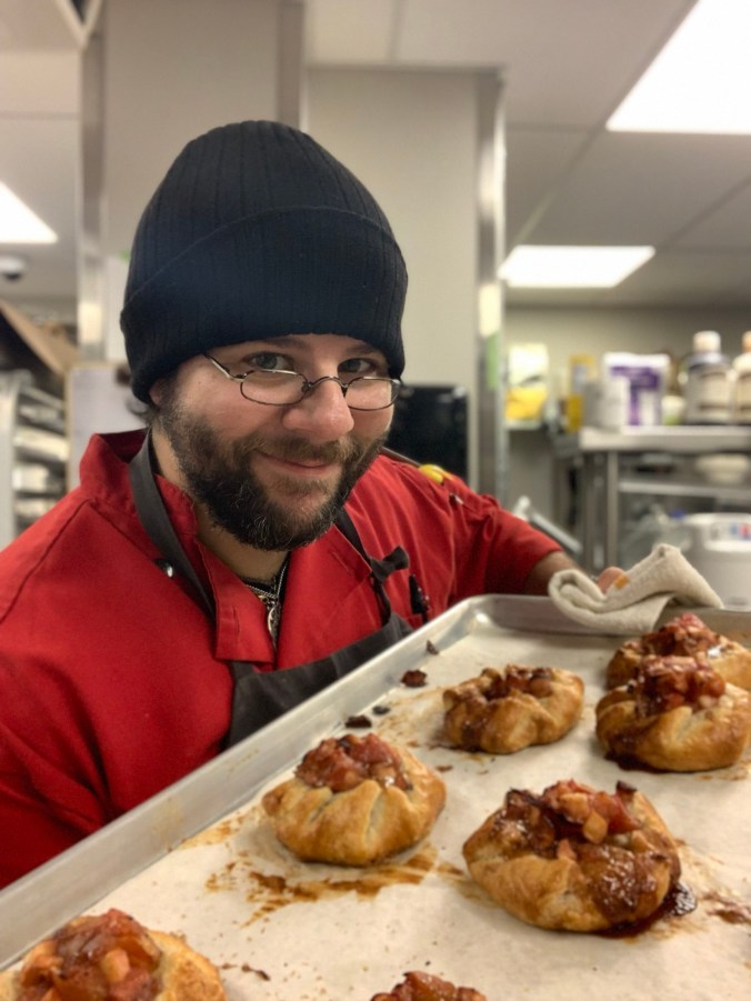 Before long, the rest of the team will be in chopping onions, frying off bacon bits for jam, and straining the bones and roasted vegetables from the giant pot of chicken stock that’s been simmering all night. The smell of roasted poultry and hot chicken fat smashed me as soon as I came in the door- on winter mornings, you can smell it in the parking lot over the icy evergreen air. The bouquet of Sweat, Energy, and Hospitality clings to my clothes after I leave. Taken out of context, it reeks of onions and grease, but I’m already adding some context of my own.